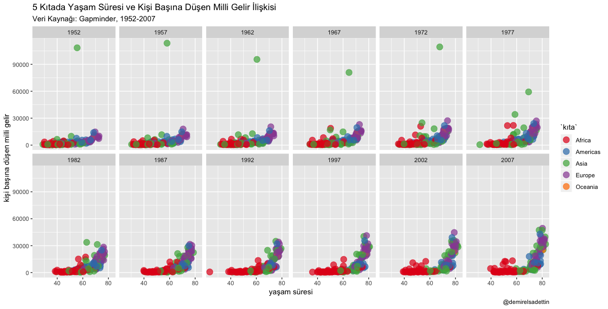 ggplot(gapminder, aes(yaşam_süresi, kişi_başı_milli_gelir, color = kıta))+ geom_point(size = 4, alpha = 0.7) + labs(x="yaşam süresi", y ="kişi başına düşen milli gelir", title = "5 Kıtada Yaşam Süresi ve Kişi Başına Düşen Milli Gelir İlişkisi", subtitle = "Veri Kaynağı: Gapminder, 1952-2007", caption = "@demirelsadettin")+ scale_color_manual(values = renk)+ facet_wrap(~yıl, ncol = 6)