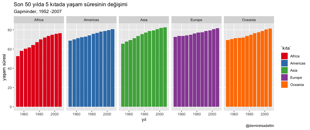 ggplot(gapminder, aes(yıl, yaşam_süresi, fill = kıta))+ geom_col(position = "dodge")+ labs(x ="yıl",y="yaşam süresi", title ="Son 50 yılda 5 kıtada yaşam süresinin değişimi", subtitle = "Gapminder, 1952 -2007", caption = "@demirelsadettin")+ scale_fill_manual(values = renk)+ facet_wrap(~kıta, ncol =5)