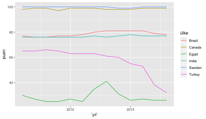 b) Çizgi grafik ise daha çok zamansal verileri görselleştirmemizde işimize yarıyor. Çizgi grafik hakkında detaylı bilgiye buradan ulaşabilirsiniz. Bu grafik tipinde gapminder verisini kullanmayacağız çünkü yıl sütunundaki değerler devamlılık göstermiyor. Gapminder verisiyle anlamlı bir çalışma elde edemeyeceğimiz için onun yerine Freedom House Dünya Özgürlükler Raporu verisini kullanacağız. Bu sefer çizgi grafik olduğu için geom_line() kullanıyoruz. Çubuk grafikten tek farkı ise renk argümanı için fill yerine color kullanmamız.