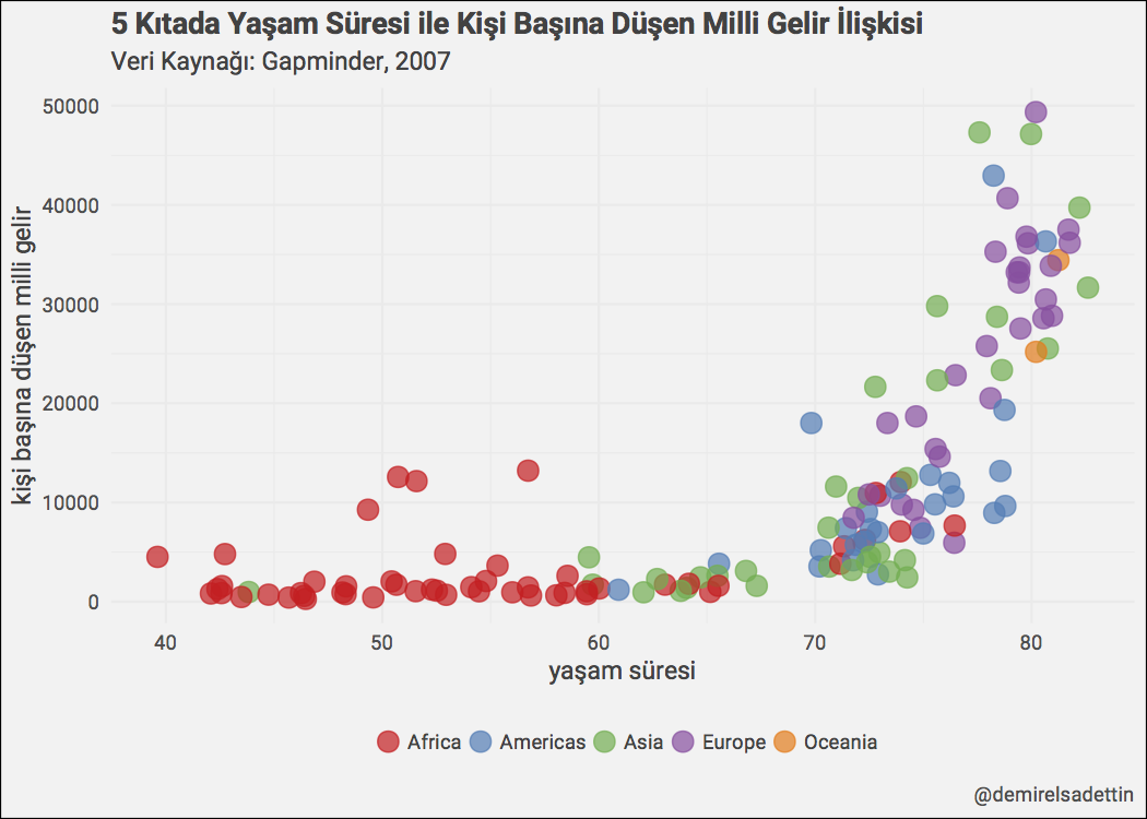 dagılım_grafigi <- ggplot(gapminder_2007, aes(yaşam_süresi, kişi_başı_milli_gelir, color = kıta))+ geom_point(size = 4, alpha = 0.7) + labs(x="yaşam süresi", y ="kişi başına düşen milli gelir", title = "5 Kıtada Yaşam Süresi ve Kişi Başına Düşen Milli Gelir İlişkisi", subtitle = "Veri Kaynağı: Gapminder, 2007", caption = "@demirelsadettin")+ scale_color_manual(values = renk)