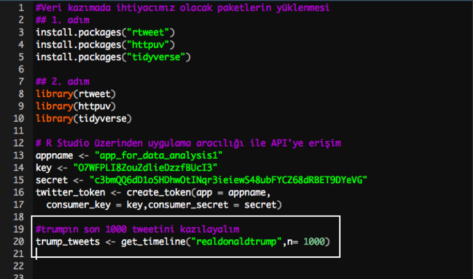 “trump_tweets <- get_timeline(“twitter id”, n= tweet sayısı))“