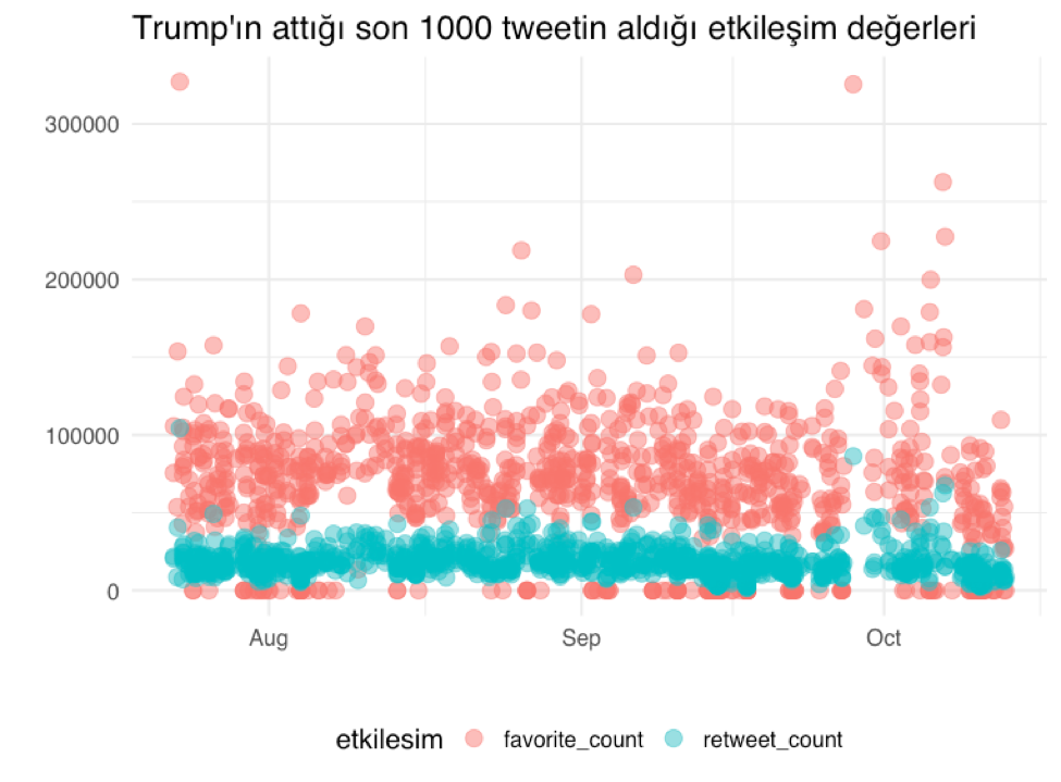 Görselleştirmede ggplot2 paketini kullanacağız. Öyle görünüyor ki Trump’ın son 1000 paylaşımında beğenilme sayıları retweet edilmesinden bir hayli fazla.