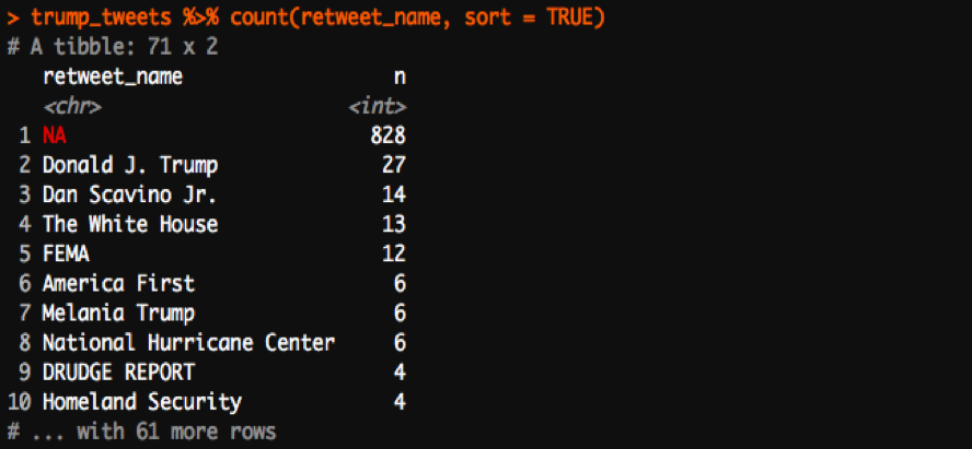 Ve bu, sadece bir kullanıcının tweetlerini çekmek istersek elde edebileceğimiz bir veri seti. Bununla birlikte, rtweet paketi sayesinde dünyada veya herhangi bir ülkedeki hashtag analizi, tweetlerin paylaşıldığı lokasyonlar, herhangi bir kullanıcının takipçi sayısı, veyahut Trump’ın beğendiği tweetlere kadar farklı türde ve boyutta çok çeşitli verilere ulaşabiliriz.