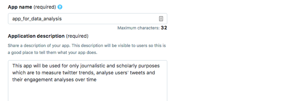 Yukarıdaki görselin sağ üst köşesinde yer alan “Twitter Engagement Analysis” menüsüne tıklayarak ilk uygulamamızı oluşturabiliriz. Karşımıza çıkan sayfadan uygulama oluştur seçeneğine tıklıyoruz. Öncelikle uygulamaya bir isim veriyoruz ve uygulamanın ne amaçla oluşturulduğuna dair birkaç cümlelik bir açıklama yazıyoruz.