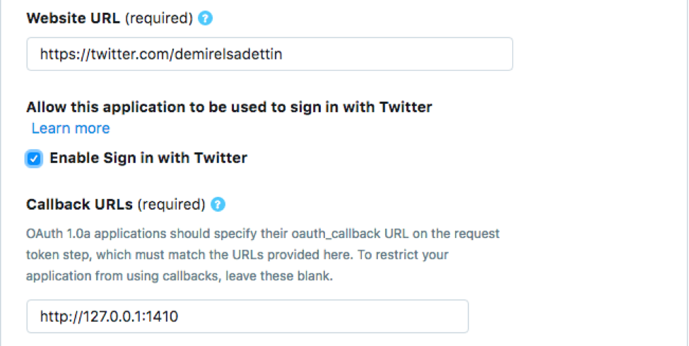 Web sayfa adresine twitter profil adresinizi ekleyebilirsiniz. Twitter ile giriş yapmayı işaretledikten sonra Callback URL kısmına http://127.0.0.1:1410/ adresini ekliyoruz. R ile API’ı bağlandığımızda tarayıcı tarafından bu adrese yönlendirileceğiz.