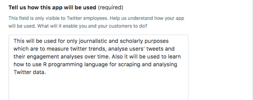 En alttaki kısma ise uygulamanın ne için kullanılacağına dair daha detaylı bir bilgi eklememiz gerekiyor. Bu kısma, uygulamayı akademik çalışmalar veya gazetecilik amaçları için kullanacağınız veya kod öğrenmek için kullandığınızı ekleyebilirsiniz.