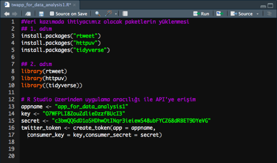 Uygulama detaylarını tamamladıktan sonra en önemli kısma geldik. Bu kısımda kodlar API’e erişimimizi sağlayacak. Kendi uygulamanızdaki API Key ve API Secret Key’leri bir yere not etmeniz önemli. R üzerinden uygulamaya erişmek için bu token’leri kullanacağız.