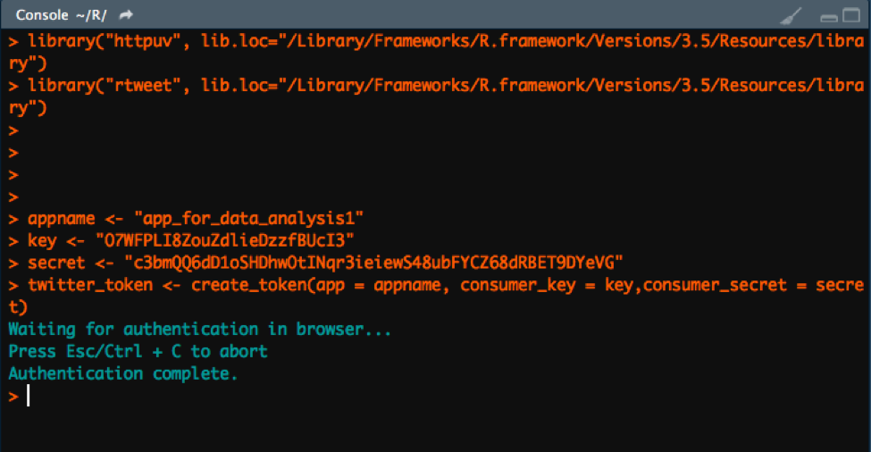 Sonraki adım en önemlisi. İlk olarak uygulamanın adını (appname), API anahtarını (key) ve API gizli anahtarını (secret) yukarıdaki görselde ve kaynak kodda olduğu gibi konsola giriyoruz. Bu aşamada API’e erişim sağladığımızı belirten boş bir tarayıcı sayfası açılmalı. R studio konsolda da bunu açık bir şekilde görebiliriz.