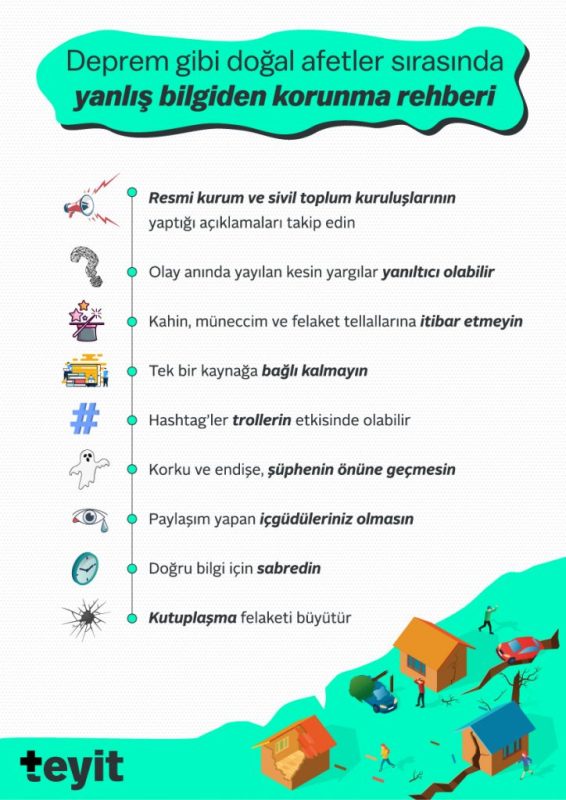 Böyle durumlarda sosyal medya kullanımı da çok dikkat edilmesi gereken bir nokta. Yanlış bilginin en çok yayıldığı alanlardan birisi olduğu için, elinize gelen her bilgiyi çok daha hassas bir şekilde incelemeniz gerekiyor. Bu konuda zaten tecrübeli olan teyit platformları ile iletişime geçip ortak çalışmak mümkün. Söz konusu uluslararası bir kriz ise benzer ortaklıklar ülkeler arasında kurulabilir. Aynı şekilde sosyal medyadaki herhangi bir hesap yerine, doğrudan o bölgede çalışan gazeteciler ve kurumlar ile iletişime geçip elinizdeki bilgileri doğrulamanız da çok önemli. Çünkü afet durumunda hızlı bilgi değil, sağlıklı bilgi kıymetli.
