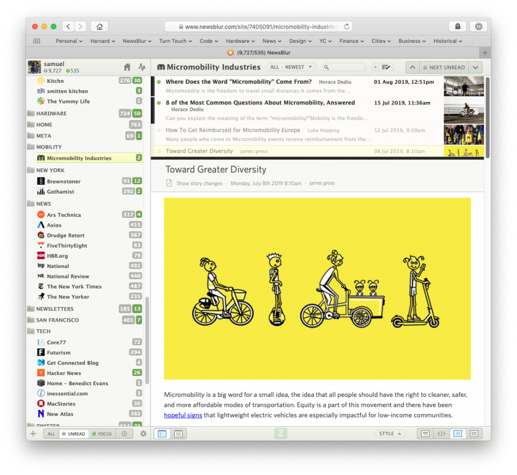 RSS’in sağladığı bu özgürlük bir gazeteci için de büyük bir güce dönüşebilir. Belirli konularda takip etmek istediğiniz çeşitli kaynakları derlemek ve tek bir noktada gözden geçirmek —üstelik reklamlar ve algoritmalarla uğraşmadan— aradığınızı bulmayı kolaylaştıracaktır. Birden çok konuyu takip ediyorsanız da tek yapmanız gereken okuyucunuzda klasör oluşturmak.
