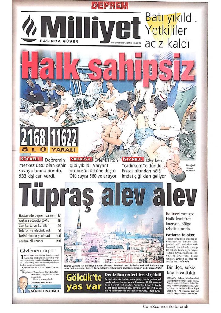 “(…) Tüpraş’ta salı günü (17 Ağustos) akşam üzeri işin tehlikeli boyutlara geldiği belli oldu. Yurtdışından uzman yardımı istemek ise dün gece yarısına doğru gündeme geldi. Yabancı yardımcı uçaklar gece yarısı üçten sonra Türkiye’ye ulaştılar. Ve sabaha kadar beklediler. Yabancı ülkelerden yardım istemek için neden bu kadar zaman kaybedildi?”