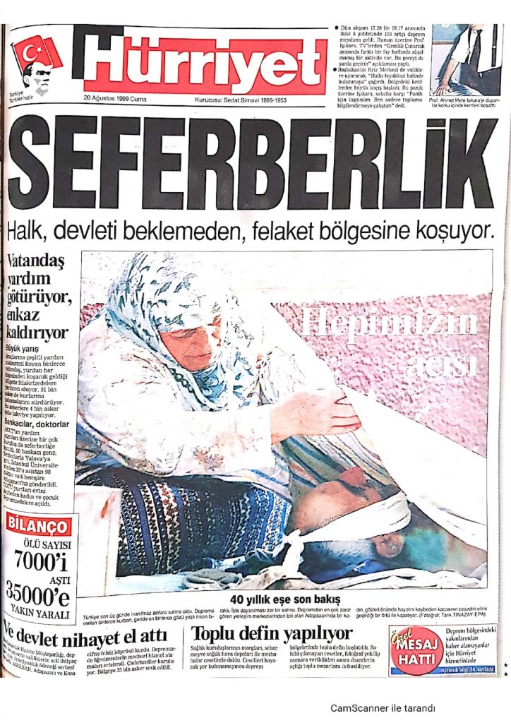 20 Ağustos tarihli Hürriyet’in manşeti “Seferberlik”ti. Ülkenin farklı kentlerinden bölgeye gelen vatandaşların çabalarına yer verilirken, “Başbakanlık Hazine Müsteşarlığı’nın deprem bölgesinde valiliklerin acil ihtiyaçları için 18 trilyonluk ödeneği serbest bıraktığı” bilgisi, “Ve devlet nihayet el attı” başlığıyla sayfanın sol alt köşesinde aktarılıyordu. İlerleyen sayfalarda İsrailli kurtarma ekibinin “insan üstü” çabası yarım sayfaya basılmıştı.