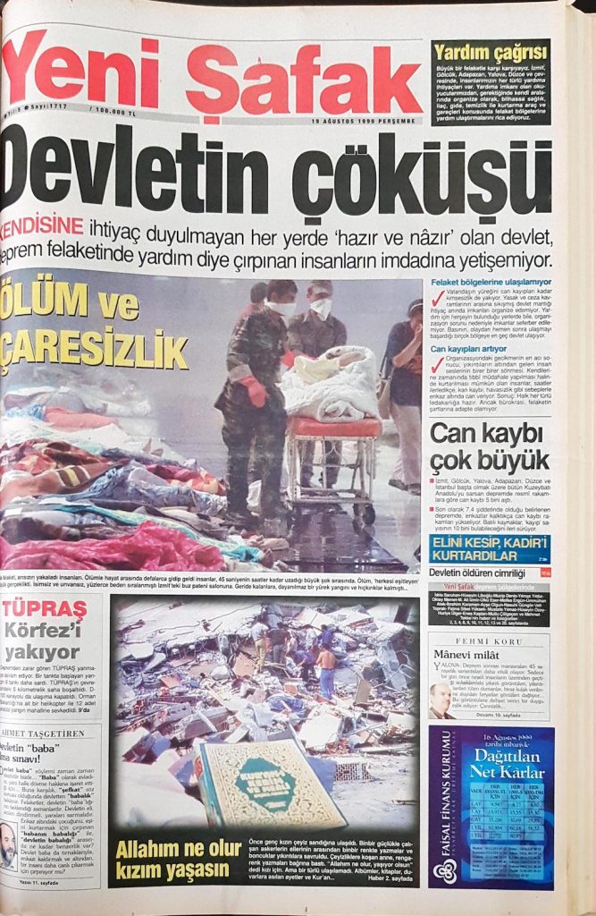20 Ağustos tarihli Yeni Şafak, “Devletin kurbanı olduk” başlığı altında depremin vatandaşı düşürdüğü duruma sayfalarında geniş yer ayırırken, “Yardım Yağmuru” başlığı altında bir sütun boyunca Belçika, İspanya, Japonya, Yunanistan ve Almanya’dan gelen yardımlara yer veriyordu.