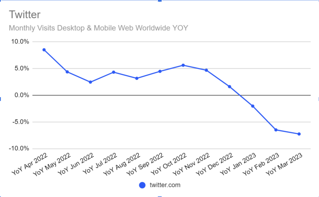 1- Twitter trafiğindeki genel düşüş. Her ne kadar Elon Musk her şeyin daha iyiye gittiğini, rekordan rekora koştuğunu iddia etse de SimilarWeb’e göre Twitter’ın çeşitli trafik istatistiklerinde geçtiğimiz yıla göre yüzde 10’u geçen düşüşler var. Birçok kullanıcı Elon Musk’ın Twitter’ı satın almasından bu yana bir tepki olarak Twitter’ı bıraktı. Birçoğu da Twitter kullanımını azalttı. Twitter’dan göçen kullanıcıların bazısı Mastodon’a, bazısı BlueSky’a, bazısı Threads’e bazısı da hiçbir şeye gitti. Bunlar henüz Twitter’ı zorlayacak ciddi birer rakip olmasalar da azalan trafiğin bir kısmını açıklayabilir.