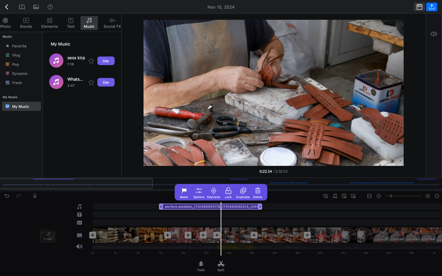 Videoya kendi sesi dışında bir ses ya da müzik eklemek istediğinizde bunu da tıpkı görsellerde yaptığınız gibi bilgisayarınızdan sürükleyip bırakabilirsiniz. Bunun dışında “Music” ve “Sound FX” bölümündeki stok sesleri kullanmayı da tercih edebilirsiniz.