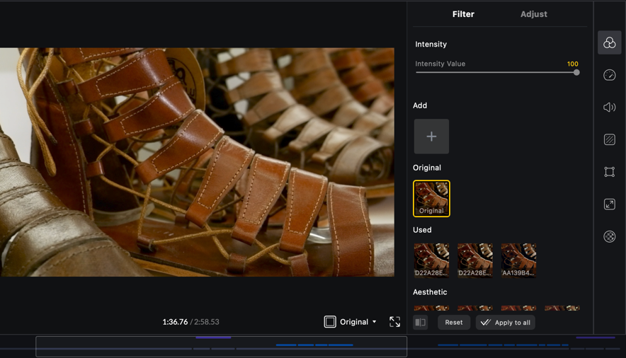 Ayrıca uygulamanın sağ tarafında yer alan ikonlardan yukarıdan aşağıya sırasıyla filtre, hız, ses seviyesi, bulanıklık, kenarlık, yakınlaştırma ve opaklık gibi ayarlamaları yapabilirsiniz. Bunları kullanarak videonuza yeni katmanlar ekleyebilir, onu daha hareketli ve ilgi çekici bir hâle getirebilirsiniz.