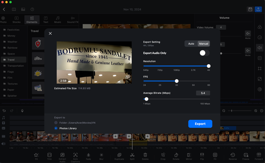 Videonuz bitti ve artık çıktısını almanız gerekiyor. Bu aşamaya geldikten sonra sağ üstte yer alan ikonlardan soldakiyle projenizi kaydedip sağdakiyle videonuzun çıktısını alabilirsiniz. Manuel ya da otomatik yazan kısımlardan gerekli ayarlamaları yapıp “Export” butonuna tıkladığınızda işlem başlıyor.