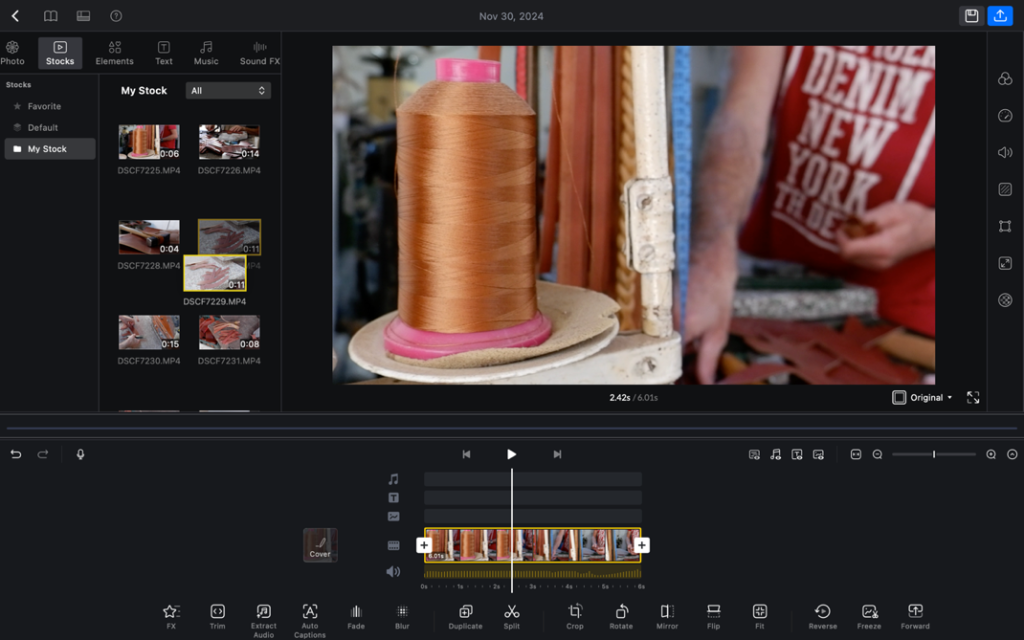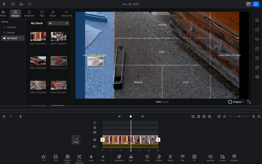 Çalışma alanındaki videoları silmek için “delete“, kırpmak için “split” tuşu kullanılıyor. Bilgisayardaki görselleri her seferinde dosyadan sürüklemek zor gelecek derseniz, kullanacağınız görselleri toplu olarak “Stocks” bölümüne sürükleyebilir ya da “photo” kısmından ulaşabilirsiniz.