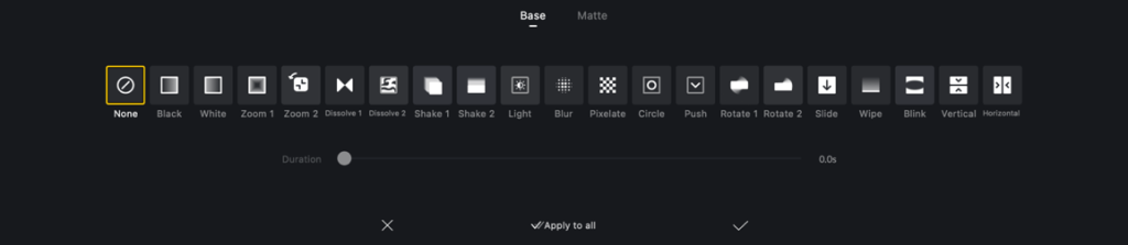 Yukarıda yer alan geçiş tipleri videonuzu daha ilgi çekici hâle getirebilir. Deneyerek videonuza en uygun geçişi bulabilir ve onu özelleştirebilirsiniz. “Duration” kısmıyla bu geçişin süresini ayarlayabilirsiniz.