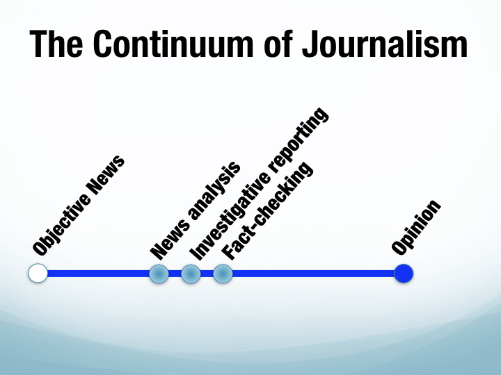 Bill Adair, Columbia Journalism Review için kaleme aldığı yazısında bu sorunu kapsamlı bir şekilde işlemiş ve aslında sorunun gazetecinin taraflı olup olmaması değil, bunun açık bir şekilde dile getirilmemesi olduğunu anlatmış. Adair, tamamen veri odaklı veya bir olayı aktaran objektif haberler gibi tamamen tarafsız işler ve fikir yazıları gibi tamamen bir fikri desteklemek odaklı işler dışında diğer tüm gazetecilik işlerinin tarafsızlık anlamında ikisinin arasında bir yere düştüğünü ve bunun aksinin zaten mümkün olmadığını söylüyor.